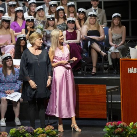 Ásdís Arnalds aðstoðarskólameistari flutti einnig ávarp og hvatti nemendur til að leggja áherslu á góðmennsku framar öllu öðru í lífinu og vísaði í fallega sögu Astrid Lindgren um bræðurna Ljónshjarta. Fráfarandi forseti nemendafélagsins, Embla María Möller Atladóttir, flutti ávarp nýstúdents og Ásdís Ingólfsdóttir flutti ávarp fyrir hönd 50 ára útskriftarárgangs skólans. Hún og Svanhildur Agnarsdóttir færðu skólanum gjöf af sama tilefni. Svo skemmtilega vill til að þær hafa báðar starfað við Kvennaskólann í áratugi en ætla á vit nýrra ævintýra í haust.