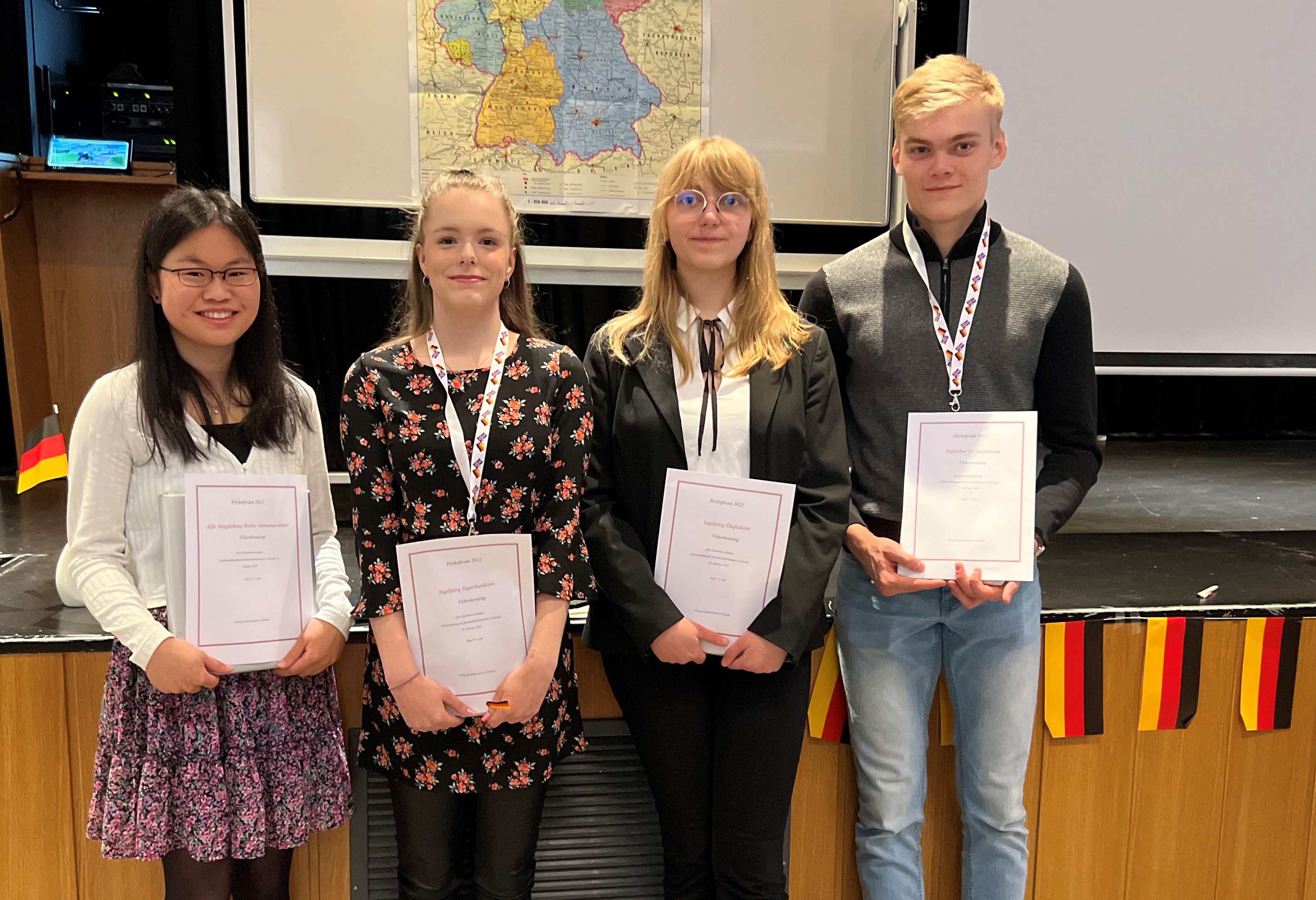 Alfa Magdalena Birnir Jórunnardóttir í 3.H gerði sér lítið fyrir og sigraði í þrautinni á stigi 2 sem er fyrir lengra komna nemendur. Hún hlýtur að launum námsferð til Þýskalands í sumar. Á stigi 1 lenti Ingibjörg Sigurðardóttir í 3. sæti, Sigurður Ari Stefánsson í 4. sæti og Ingibjörg Ólafsdóttir í 5. sæti, þau eru öll í 2.NA.