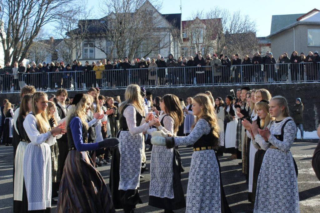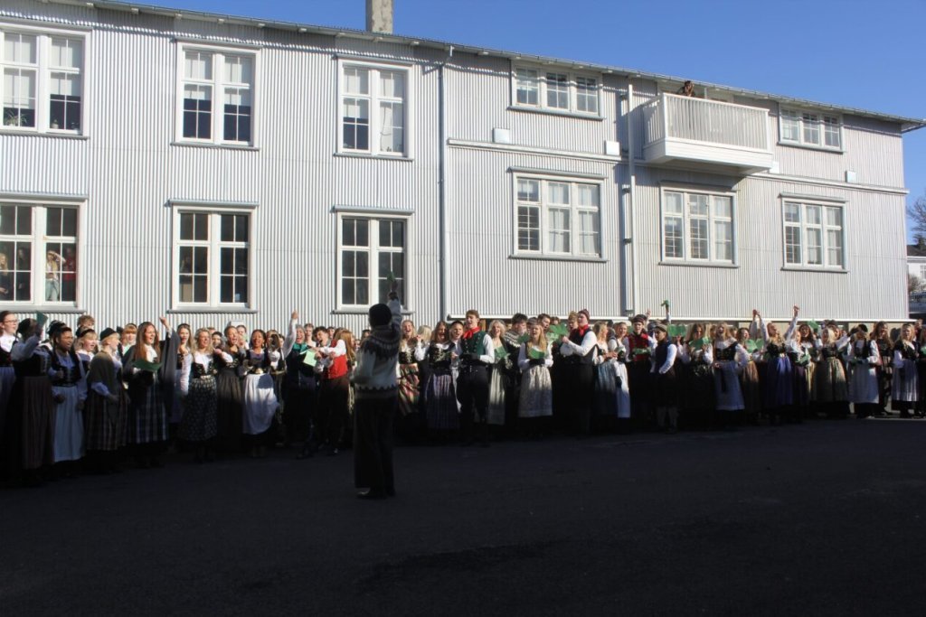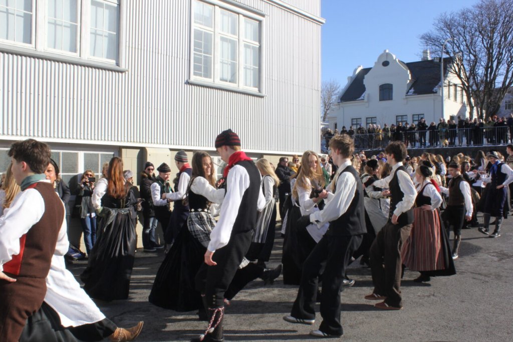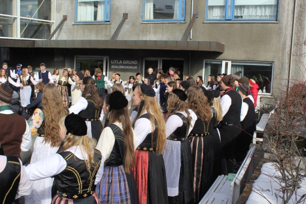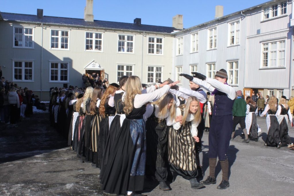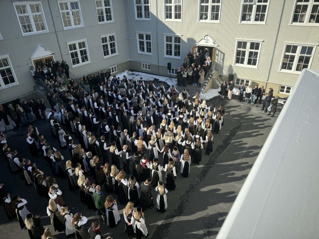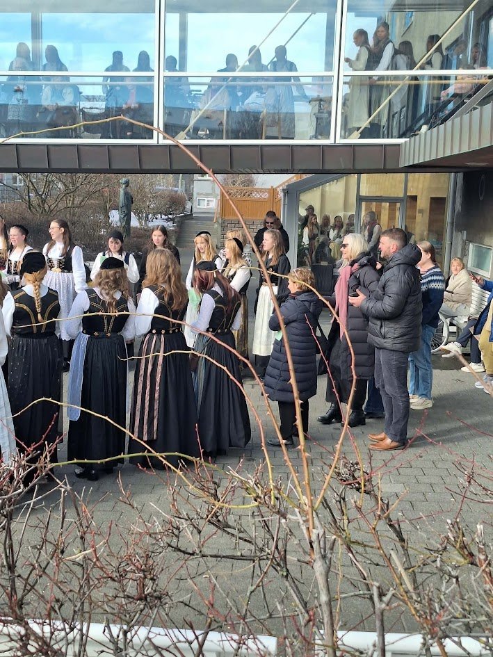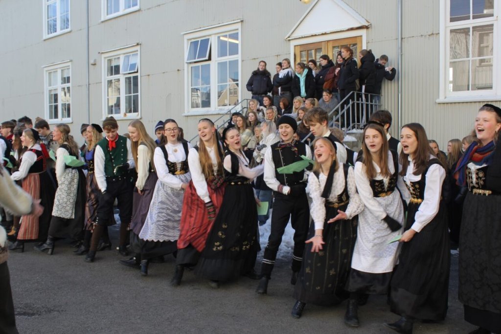 Það voru góð ráð dýr þegar gefin var út appelsínugul viðvörun fyrir peysufatadaginn. Ákveðið var með skömmum fyrirvara að halda hann hátíðlegan degi fyrr, 25. mars, og það í fallegu sólskinsveðri. Nemendur á 2. ári dönsuðu og sungu á Ingólfstorgi, í porti Kvennaskólans, fyrir íbúa og starfsfólk á Grund og loks í Þjóðminjasafni Íslands. Safnið tók vel á móti hópnum í lok dags og bauð upp á hressingu sem við kunnum bestu þakkir fyrir. Margrét Helga Hjartardóttir frönskukennari hafði sem fyrr veg og vanda að öllum undirbúningi. Atli Freyr Hjaltason frá Þjóðdansafélaginu kenndi nemendum danssporin og Gísli Einarsson sá um harmonikkuleik allan daginn. Við þökkum þeim öllum kærlega fyrir þeirra framlag. Eins og sjá má á meðfylgjandi myndum, sem ljósmyndanefnd Keðjunnar og starfsfólk skólans tóku, ríkti mikil gleði þennan fallega dag. Einnig má finna myndir ásamt umfjöllun hjá nokkrum fjölmiðlum: Vísi, Mbl.is og RÚV.