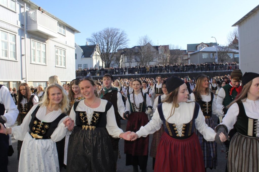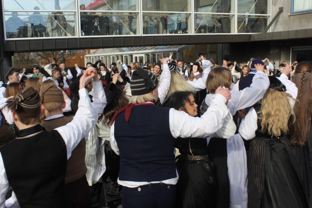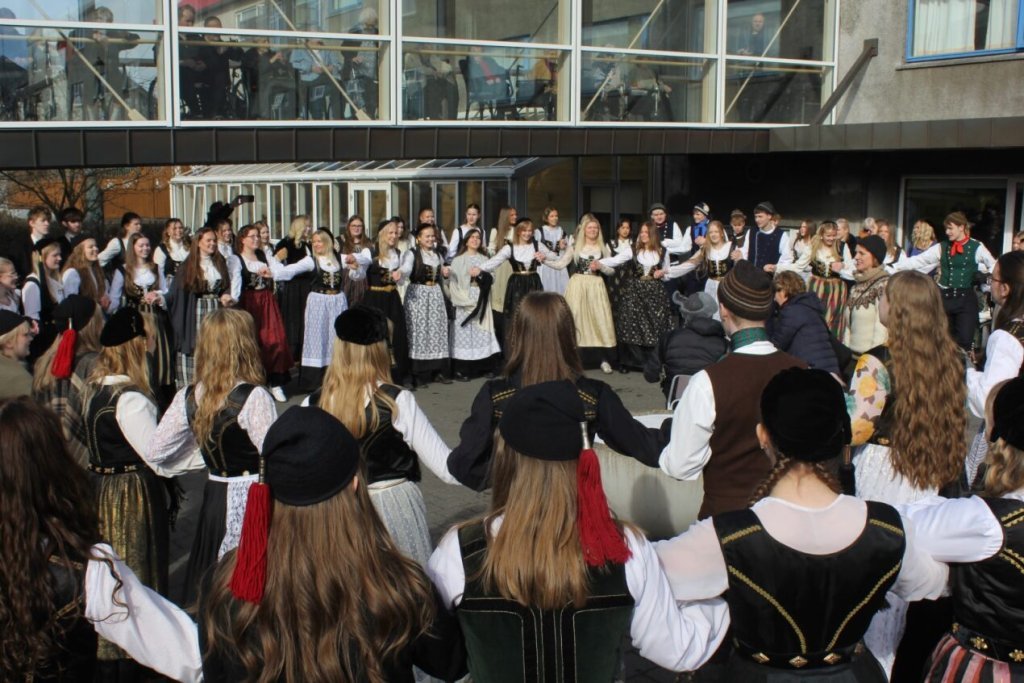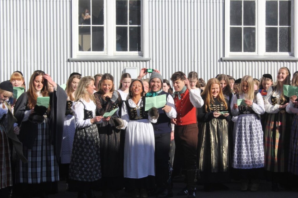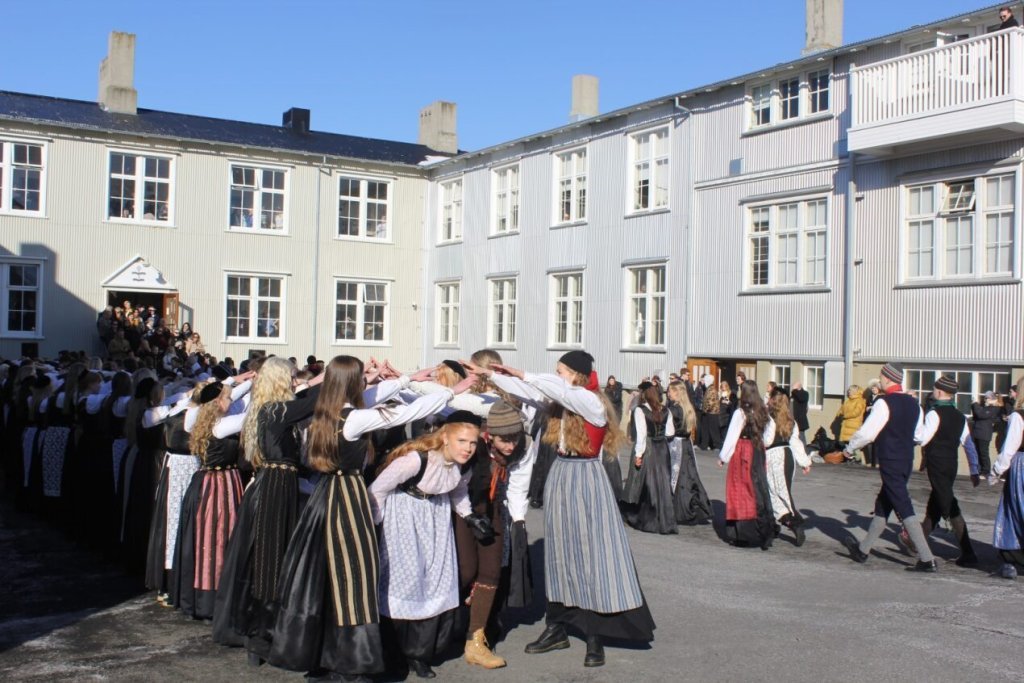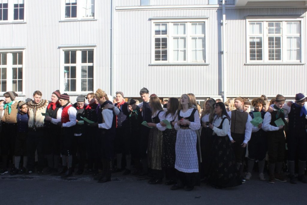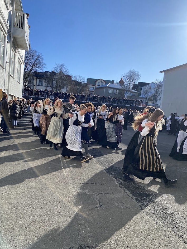 Það voru góð ráð dýr þegar gefin var út appelsínugul viðvörun fyrir peysufatadaginn. Ákveðið var með skömmum fyrirvara að halda hann hátíðlegan degi fyrr, 25. mars, og það í fallegu sólskinsveðri. Nemendur á 2. ári dönsuðu og sungu á Ingólfstorgi, í porti Kvennaskólans, fyrir íbúa og starfsfólk á Grund og loks í Þjóðminjasafni Íslands. Safnið tók vel á móti hópnum í lok dags og bauð upp á hressingu sem við kunnum bestu þakkir fyrir. Margrét Helga Hjartardóttir frönskukennari hafði sem fyrr veg og vanda að öllum undirbúningi. Atli Freyr Hjaltason frá Þjóðdansafélaginu kenndi nemendum danssporin og Gísli Einarsson sá um harmonikkuleik allan daginn. Við þökkum þeim öllum kærlega fyrir þeirra framlag. Eins og sjá má á meðfylgjandi myndum, sem ljósmyndanefnd Keðjunnar og starfsfólk skólans tóku, ríkti mikil gleði þennan fallega dag. Einnig má finna myndir ásamt umfjöllun hjá nokkrum fjölmiðlum: Vísi, Mbl.is og RÚV.