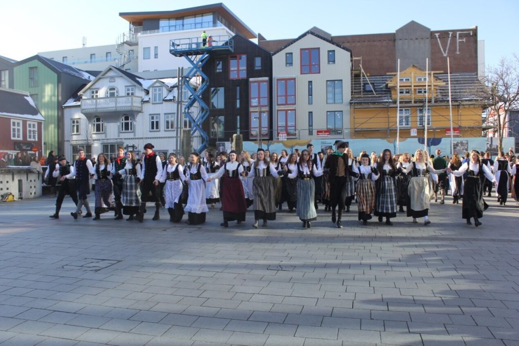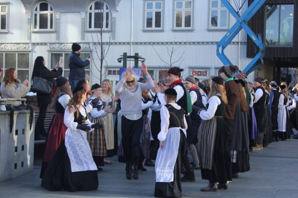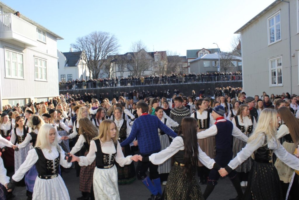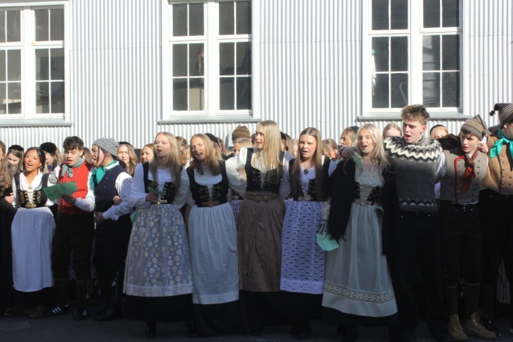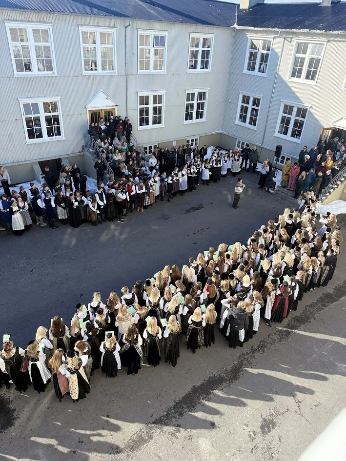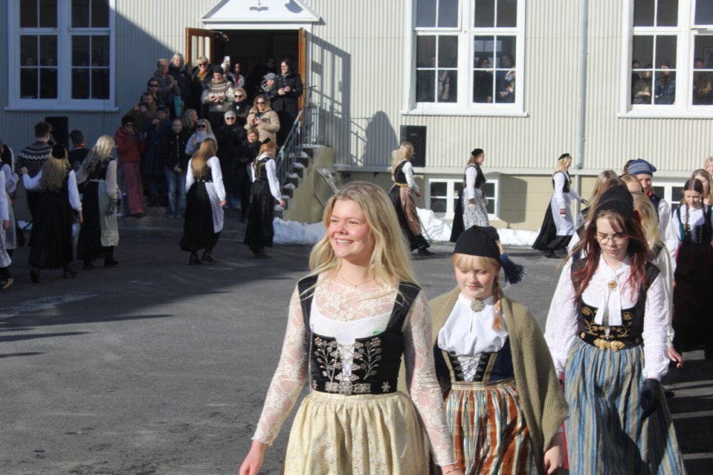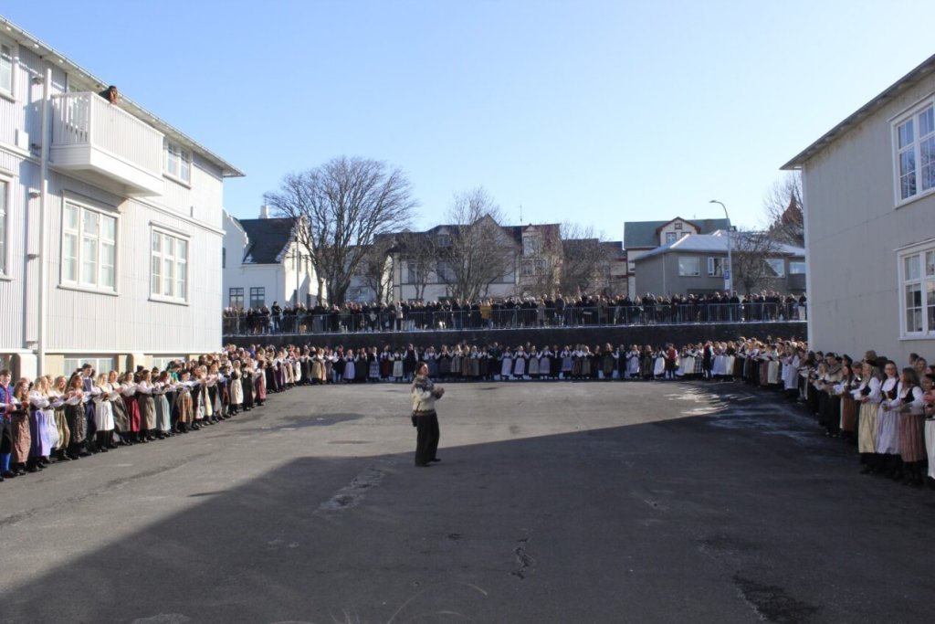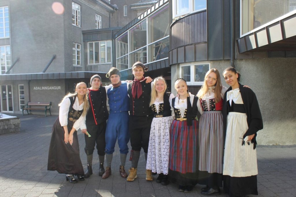 Það voru góð ráð dýr þegar gefin var út appelsínugul viðvörun fyrir peysufatadaginn. Ákveðið var með skömmum fyrirvara að halda hann hátíðlegan degi fyrr, 25. mars, og það í fallegu sólskinsveðri. Nemendur á 2. ári dönsuðu og sungu á Ingólfstorgi, í porti Kvennaskólans, fyrir íbúa og starfsfólk á Grund og loks í Þjóðminjasafni Íslands. Safnið tók vel á móti hópnum í lok dags og bauð upp á hressingu sem við kunnum bestu þakkir fyrir. Margrét Helga Hjartardóttir frönskukennari hafði sem fyrr veg og vanda að öllum undirbúningi. Atli Freyr Hjaltason frá Þjóðdansafélaginu kenndi nemendum danssporin og Gísli Einarsson sá um harmonikkuleik allan daginn. Við þökkum þeim öllum kærlega fyrir þeirra framlag. Eins og sjá má á meðfylgjandi myndum, sem ljósmyndanefnd Keðjunnar og starfsfólk skólans tóku, ríkti mikil gleði þennan fallega dag. Einnig má finna myndir ásamt umfjöllun hjá nokkrum fjölmiðlum: Vísi, Mbl.is og RÚV.