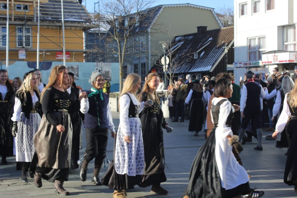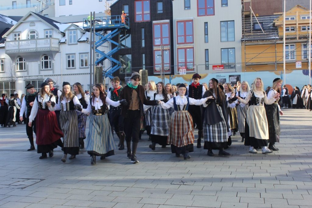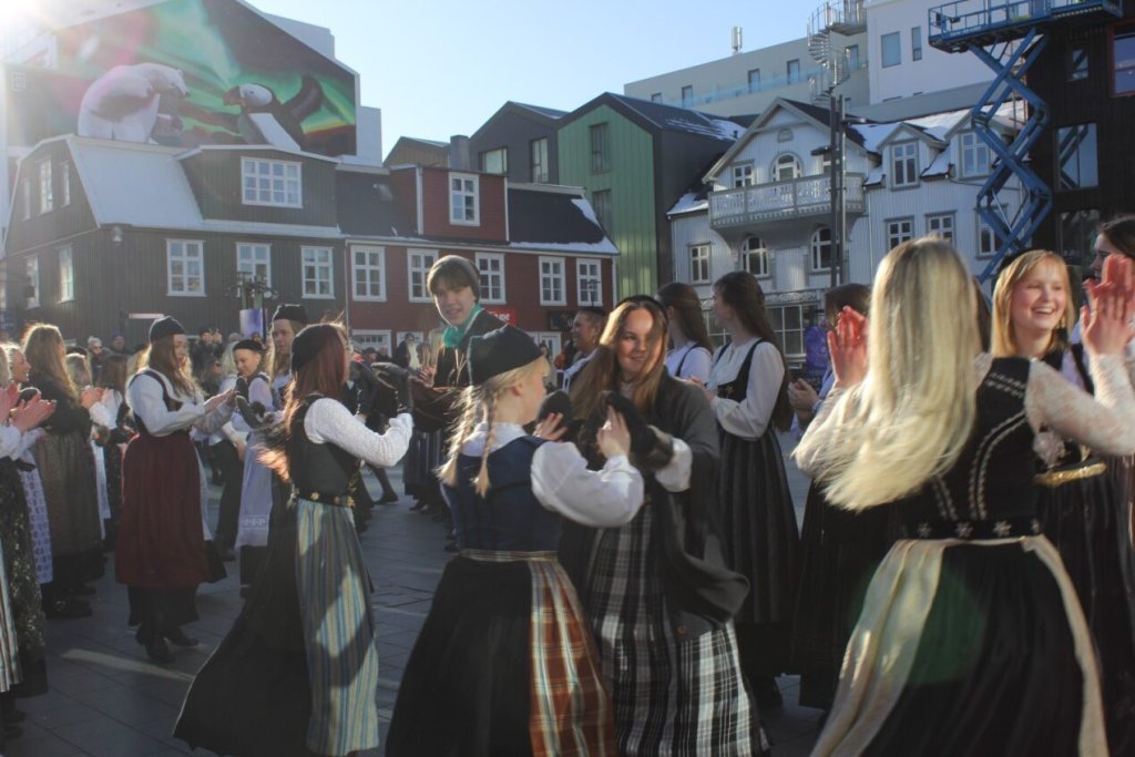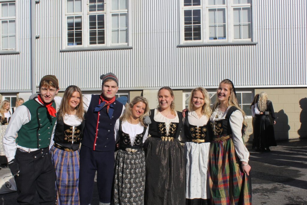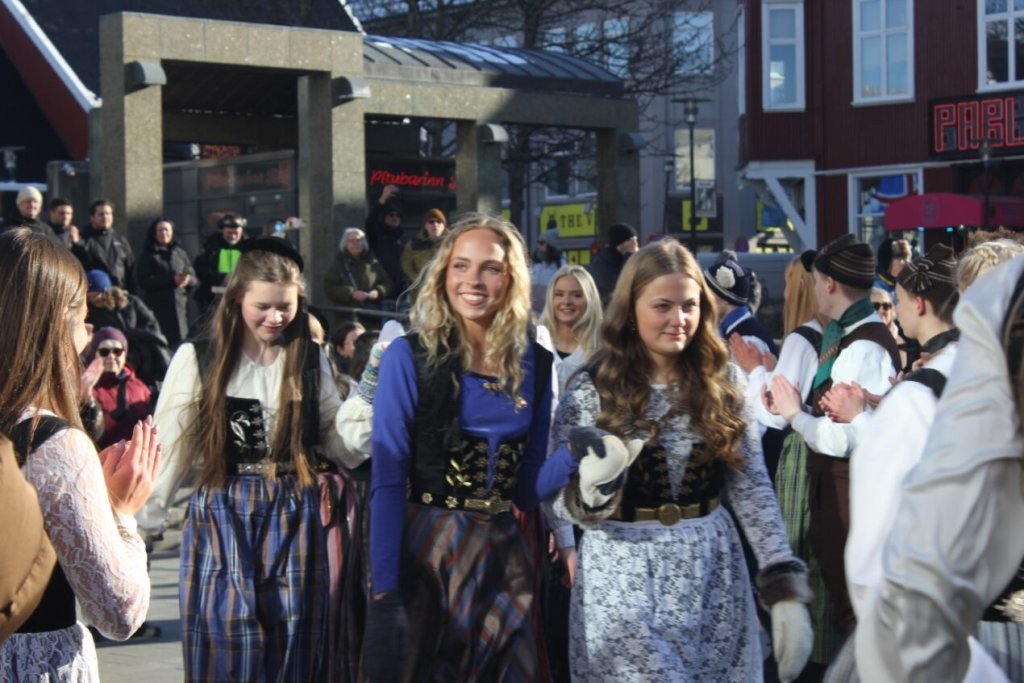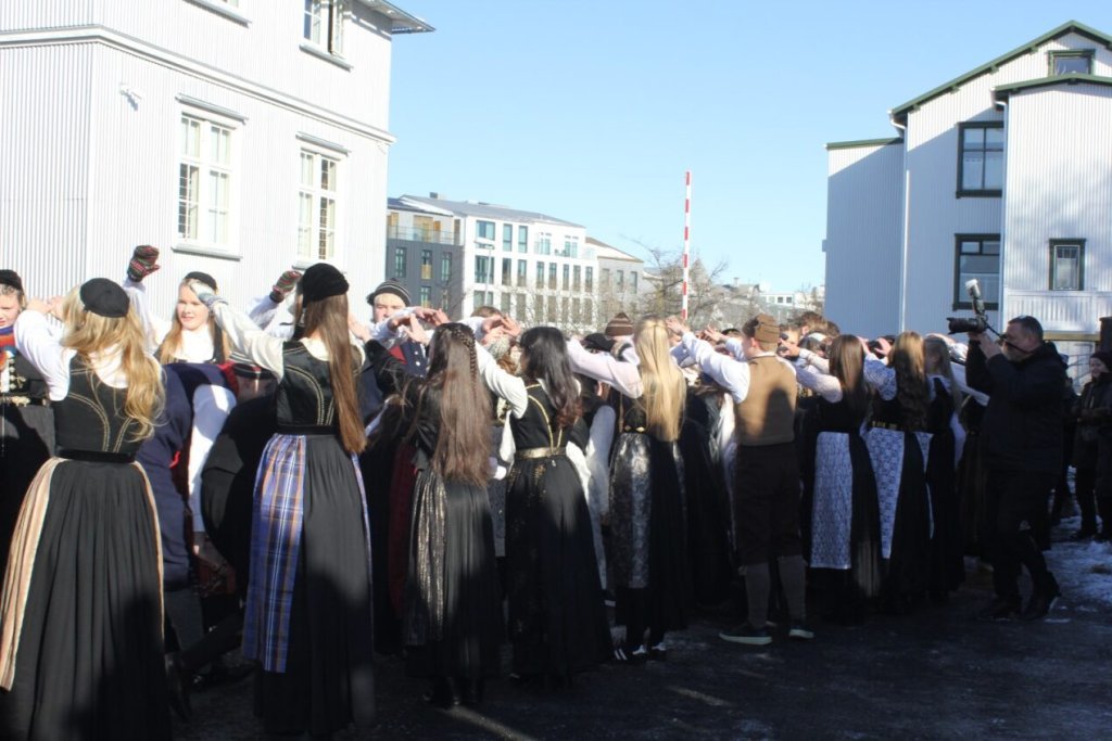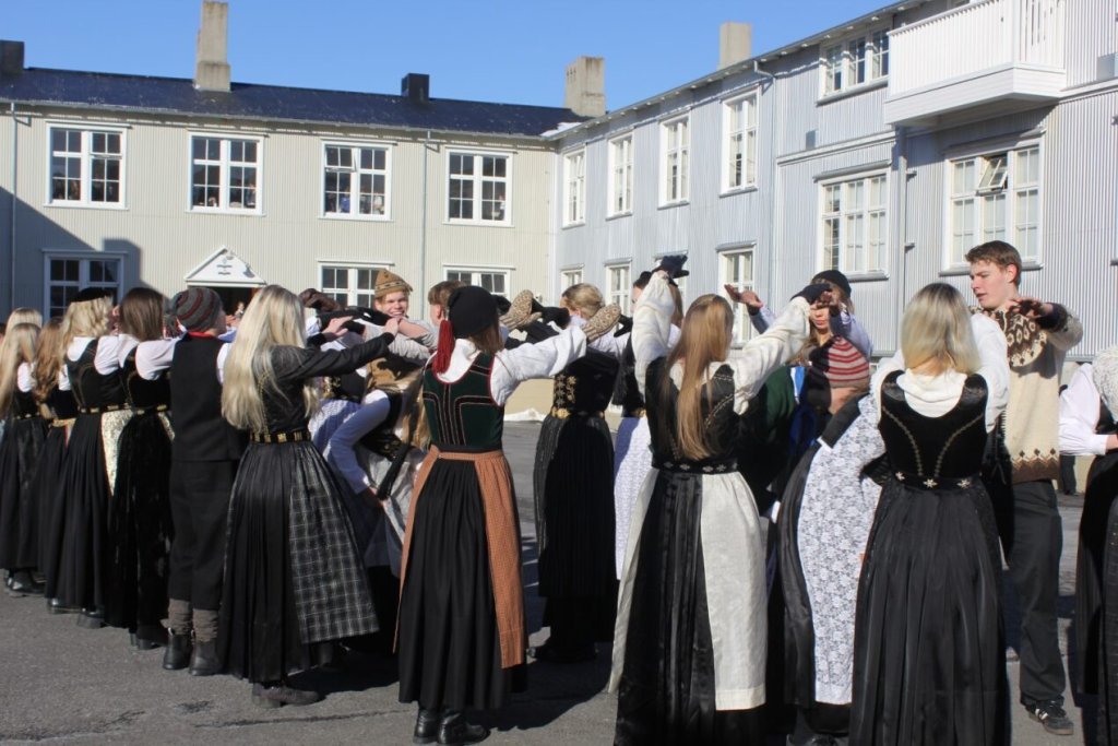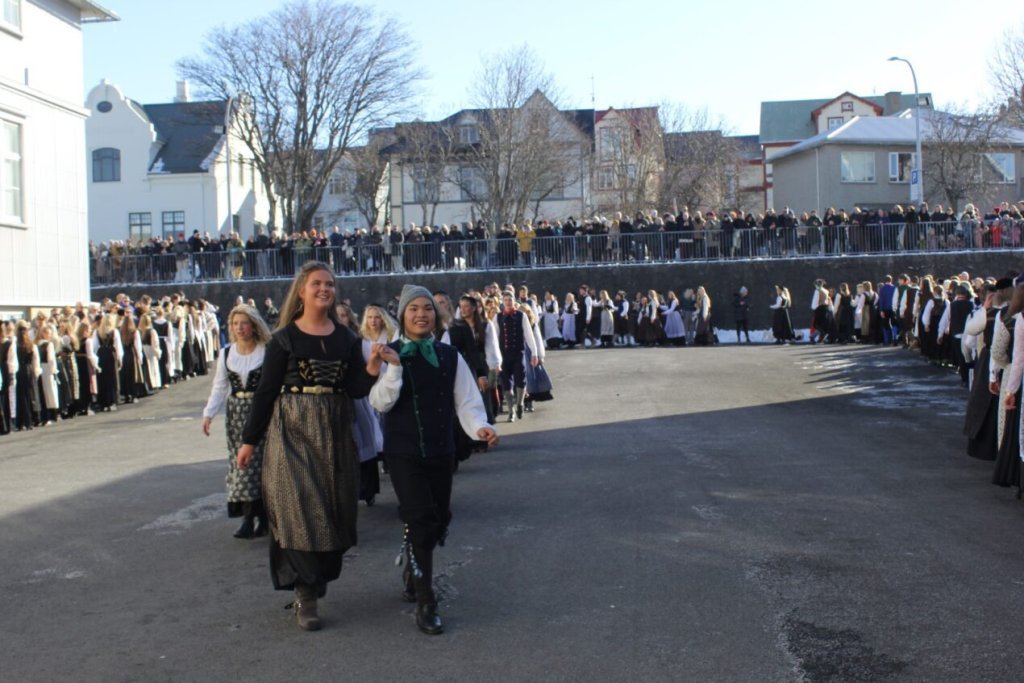 Það voru góð ráð dýr þegar gefin var út appelsínugul viðvörun fyrir peysufatadaginn. Ákveðið var með skömmum fyrirvara að halda hann hátíðlegan degi fyrr, 25. mars, og það í fallegu sólskinsveðri. Nemendur á 2. ári dönsuðu og sungu á Ingólfstorgi, í porti Kvennaskólans, fyrir íbúa og starfsfólk á Grund og loks í Þjóðminjasafni Íslands. Safnið tók vel á móti hópnum í lok dags og bauð upp á hressingu sem við kunnum bestu þakkir fyrir. Margrét Helga Hjartardóttir frönskukennari hafði sem fyrr veg og vanda að öllum undirbúningi. Atli Freyr Hjaltason frá Þjóðdansafélaginu kenndi nemendum danssporin og Gísli Einarsson sá um harmonikkuleik allan daginn. Við þökkum þeim öllum kærlega fyrir þeirra framlag. Eins og sjá má á meðfylgjandi myndum, sem ljósmyndanefnd Keðjunnar og starfsfólk skólans tóku, ríkti mikil gleði þennan fallega dag. Einnig má finna myndir ásamt umfjöllun hjá nokkrum fjölmiðlum: Vísi, Mbl.is og RÚV.