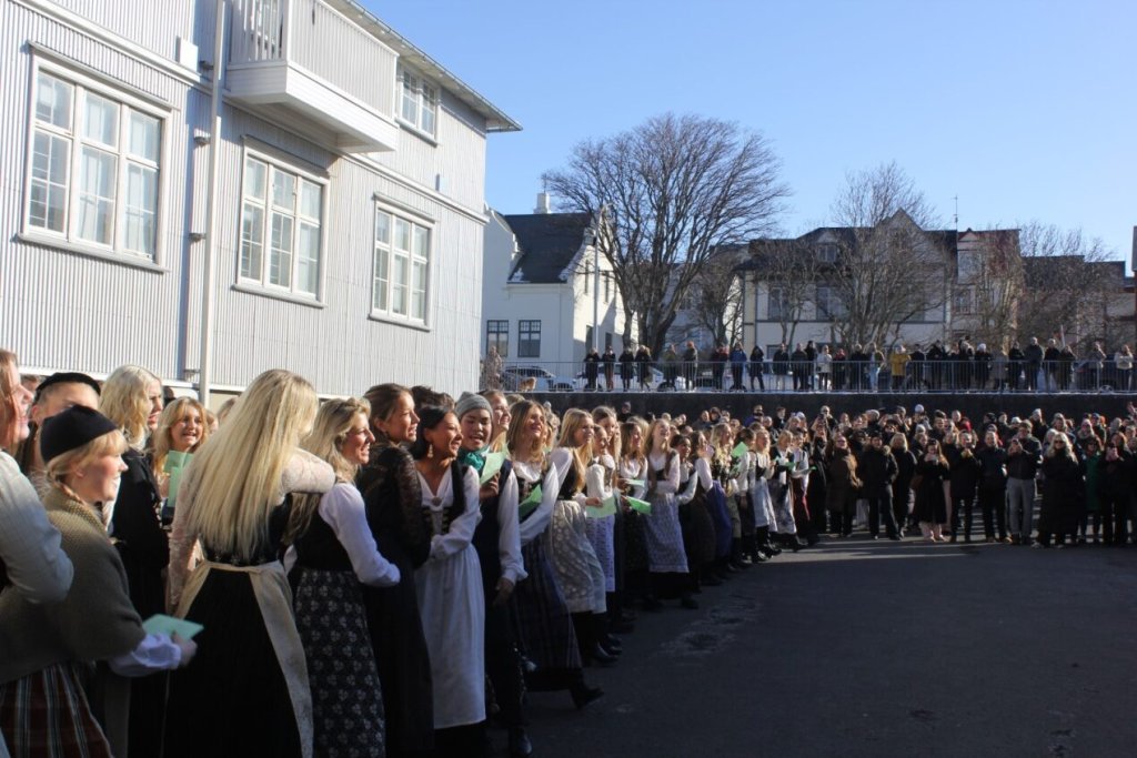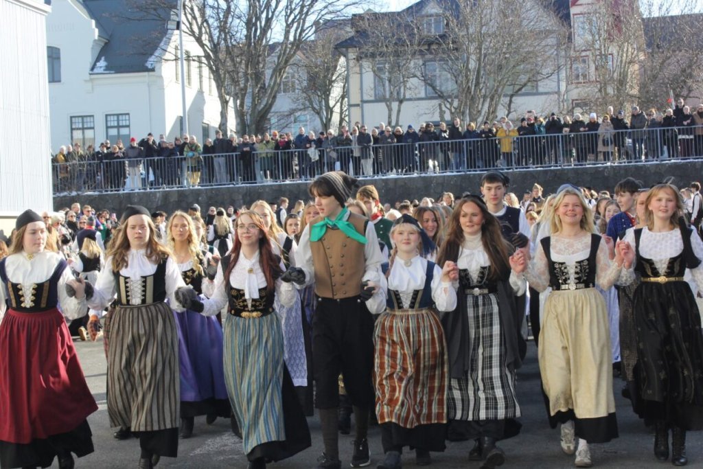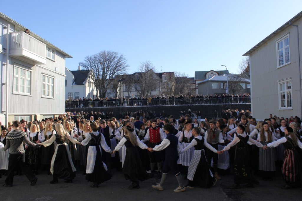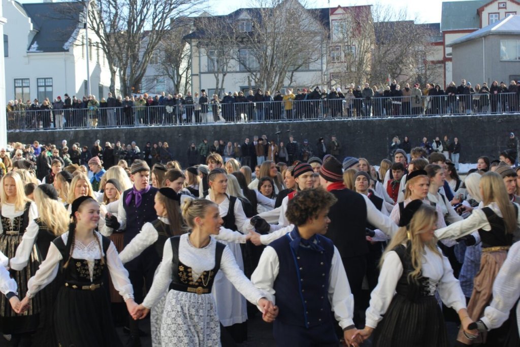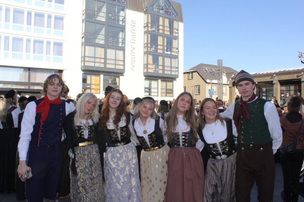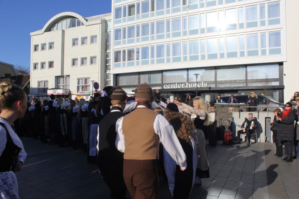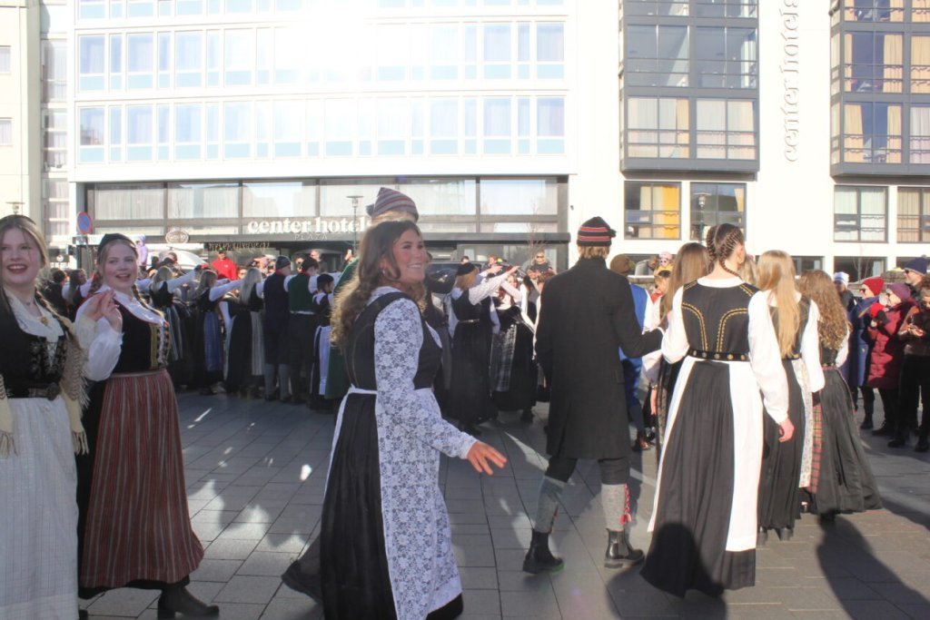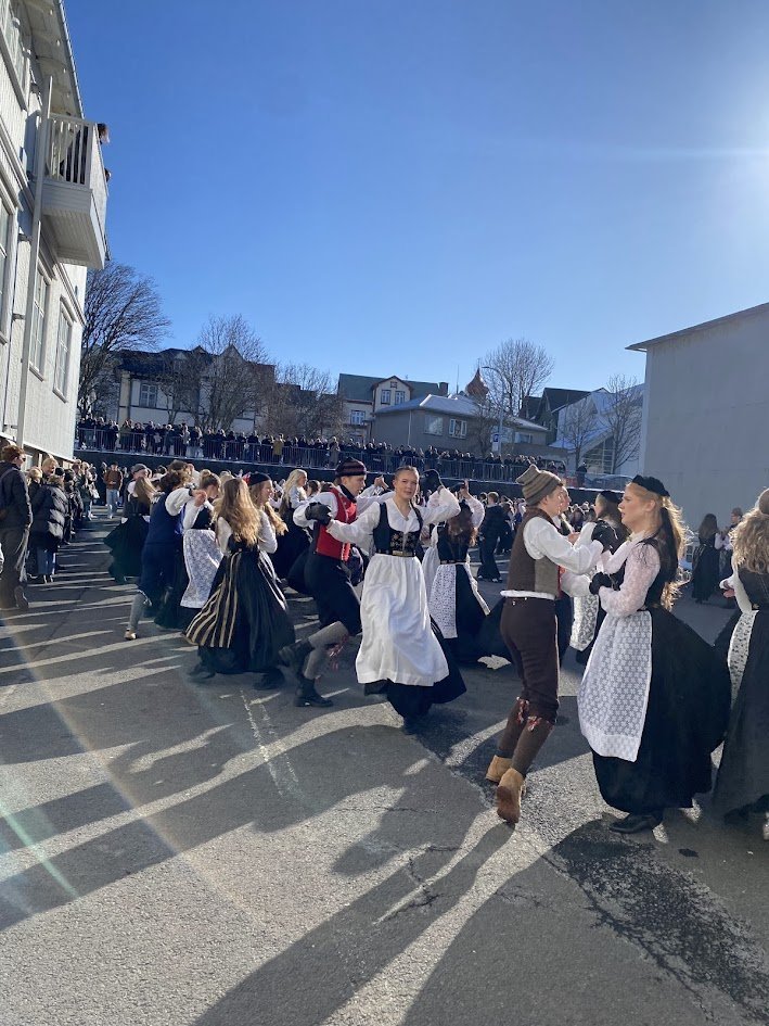 Það voru góð ráð dýr þegar gefin var út appelsínugul viðvörun fyrir peysufatadaginn. Ákveðið var með skömmum fyrirvara að halda hann hátíðlegan degi fyrr, 25. mars, og það í fallegu sólskinsveðri. Nemendur á 2. ári dönsuðu og sungu á Ingólfstorgi, í porti Kvennaskólans, fyrir íbúa og starfsfólk á Grund og loks í Þjóðminjasafni Íslands. Safnið tók vel á móti hópnum í lok dags og bauð upp á hressingu sem við kunnum bestu þakkir fyrir. Margrét Helga Hjartardóttir frönskukennari hafði sem fyrr veg og vanda að öllum undirbúningi. Atli Freyr Hjaltason frá Þjóðdansafélaginu kenndi nemendum danssporin og Gísli Einarsson sá um harmonikkuleik allan daginn. Við þökkum þeim öllum kærlega fyrir þeirra framlag. Eins og sjá má á meðfylgjandi myndum, sem ljósmyndanefnd Keðjunnar og starfsfólk skólans tóku, ríkti mikil gleði þennan fallega dag. Einnig má finna myndir ásamt umfjöllun hjá nokkrum fjölmiðlum: Vísi, Mbl.is og RÚV.